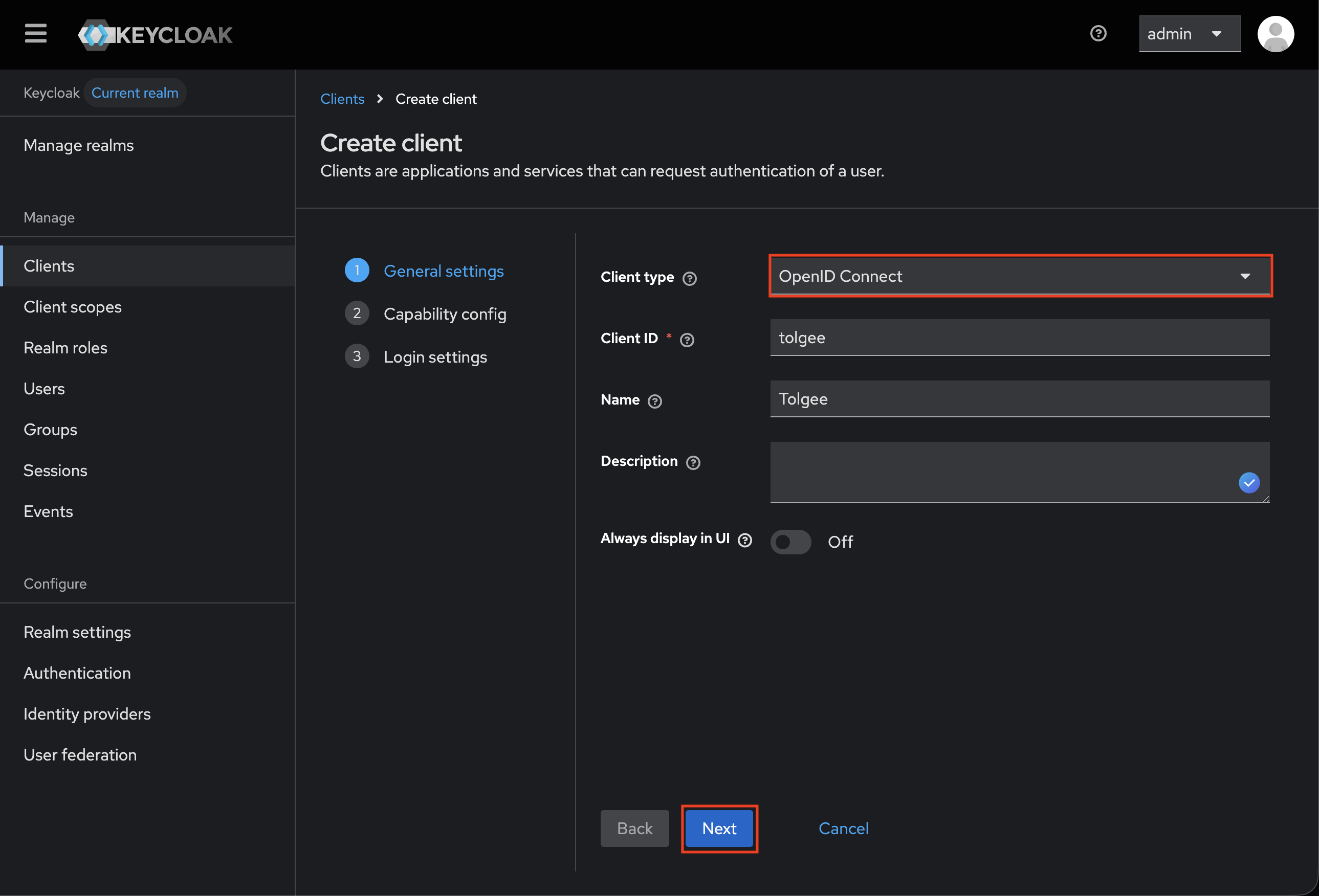 Enter a Client ID (e.g., tolgee), select OpenID Connect as the Client Type, and click Next.